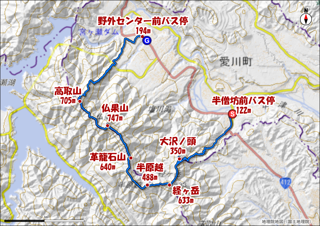 半僧坊前バス停 9:32 → 大沢ノ頭 10:39 → 経ヶ岳 11:07 → 革籠石山 12:16 → 仏果山 13:04 – 13:31 → 高取山 13:59 → 野外センター前バス停 15:31