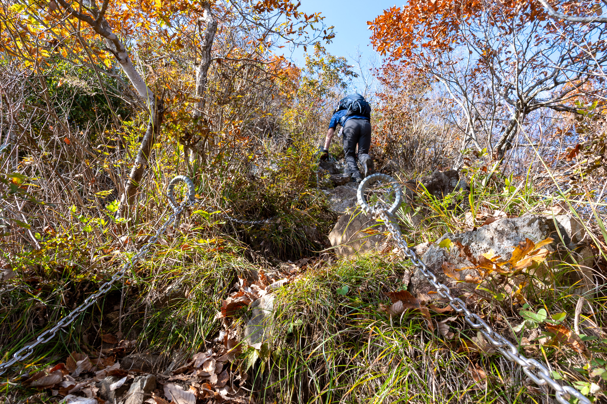 片側がやや切れ落ちている場所もありますが、ロープや鎖がしっかり設置されているので、三点支持を意識して進めば問題ありません。